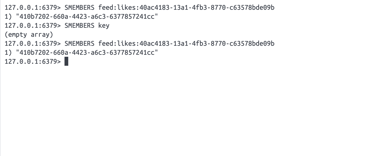 그 결과 redis에 SMEMBERS 명령어로 해당 key에 접속 해보면 해당 key를 가진 좋아요 데이터가 존재하는걸 알 수 있다.