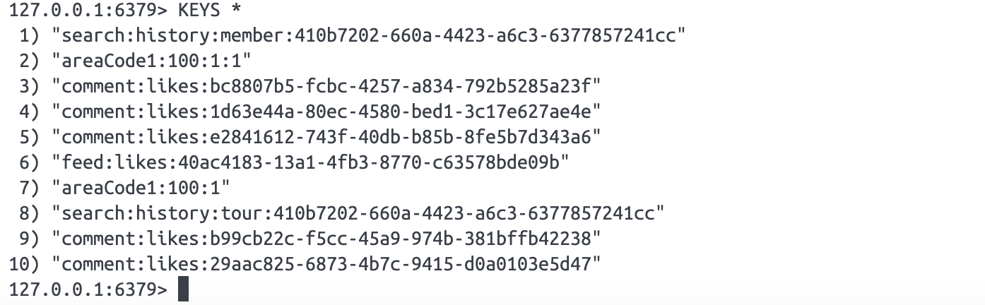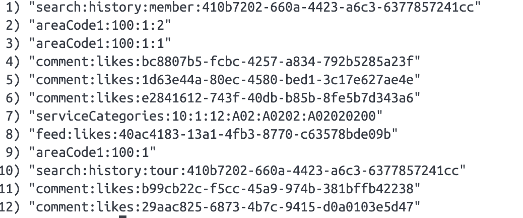 redis의 아주 기본적인 사용인 Look-aside 패턴으로 "areaCode1:100:1:1" 이 시군구들의 정보를 가져오는 캐시고 "areaCode1:100:1"이 큰 도시들 가져오는 api로 아주 잘 캐싱되고 있다.